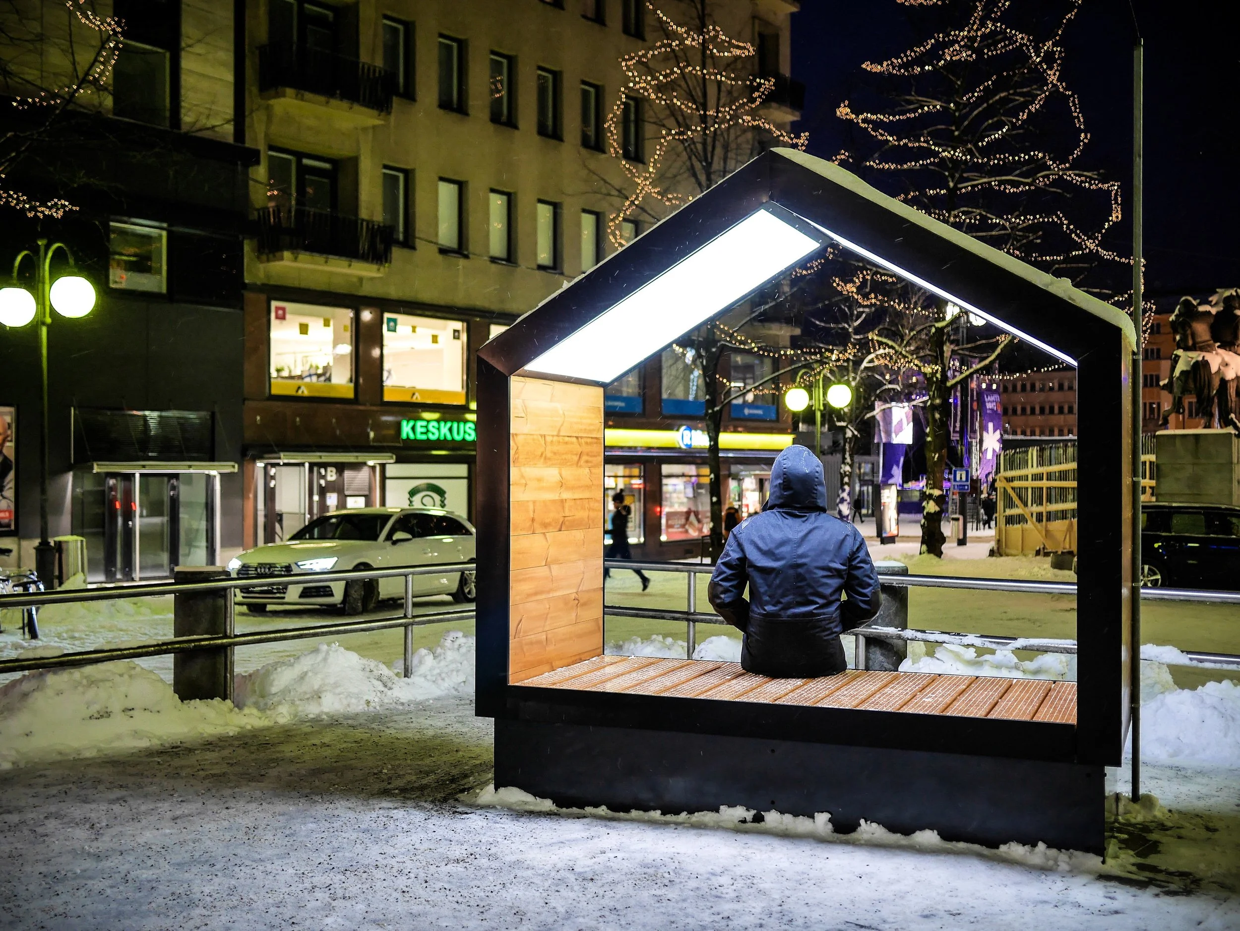 Mokša brings light into the dark Nordic winters and encourages to take a moment to sit down and admire its refined elegance and functional design language. Mokša is a piece of urban furniture that suits not only dark landscapes but also light urban spaces in the summertime.